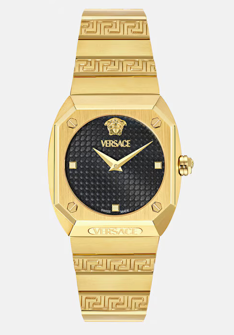 The Sport Tech chronograph watch from Versace proves that comfortable design blends with timeless luxury. Style #VELT00519 Movement: Swiss three-hand quartz Case: round two-tone stainless steel; 40mm Strap: black silicone with yellow logo Closure: butterfly clasp Dial: white sunray chronograph with date window Water resistance: to 50 meters